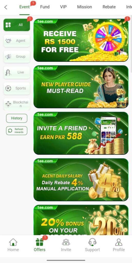 The 1ee Referral Program allows players to earn commissions by inviting friends. You’ll receive a unique referral link that you can share with others. When your friends register and play using your link, you’ll earn a percentage of their game activity as a bonus.